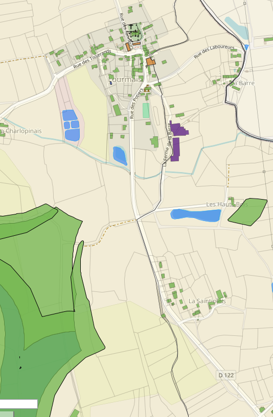 Pour la commune de Lourmais, le potentiel réside essentiellement dans la production d’énergie photovoltaïque en toitures, qu’elles soient publiques ou privées. C’est pourquoi il est prévu d’identifier tout le périmètre de la commune comme une zone favorable au développement du photovoltaïque en toiture. La carte ci-dessous montre à ce titre les toitures présentant les potentiels les plus forts :